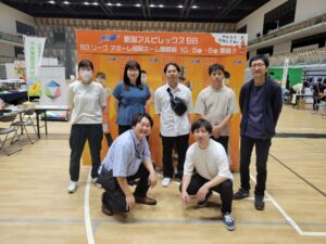 当日は、応援用ハリセンを採用していただいているアルビレックスBB様の協力で公式マスコットキャラのアルードくんや富岡選手の写真撮影もあり、大盛況でした。