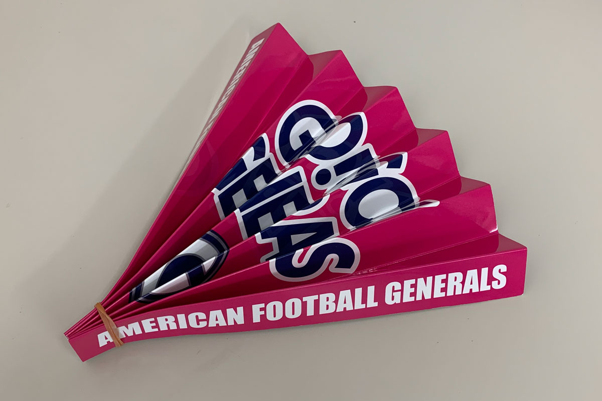 先日試合にて実際に使用させていただいたのですが、応援してくださる方々が持つことで一体感が生まれ、ハリセンの音も大きく、応援グッズとして非常に役に立ちました。デザインデータ制作からご協力頂き、誠にありがとうございました。今後とも引き続き、よろしくお願いいたします。