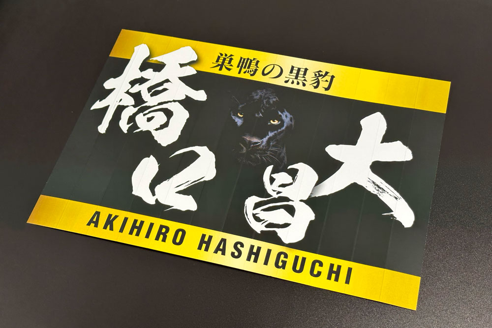 10/27デザイン打合せを行いました。トランクスの色に合わせて黒と金を使用し、キャッチコピーの「巣鴨の黒豹」と昌大(あきひろ)様の名前を追加。昌大(あきひろ)という名前が読みづらいためローマ字表記を追加。ハリセンを貰った方の記念にもなるようにデビュー戦の日付も追加するという方向で決定しました。
