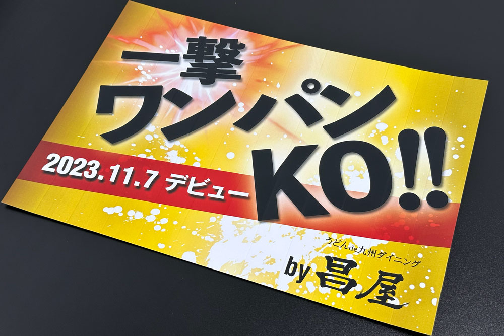 「うどんde九州ダイニング 昌屋」橋口 様。息子の昌大(あきひろ)様がボクシングのデビュー戦を控えており、30名ほどで応援に行くとのことでした。そこで人数が少なくても迫力のある応援ができる応援ハリセンをご提案させていただきました。