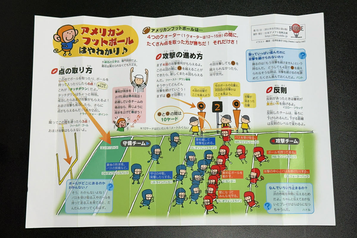 表面には大きくロゴを配置し、裏面には初めてアメリカンフットボールを観戦される方にもわかりやすようにルール説明をイラストで表現されていました。